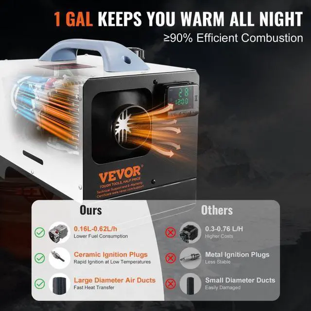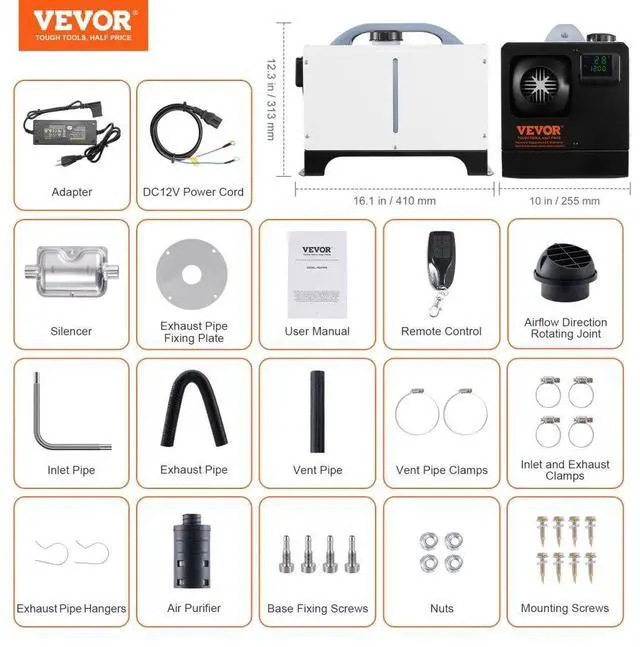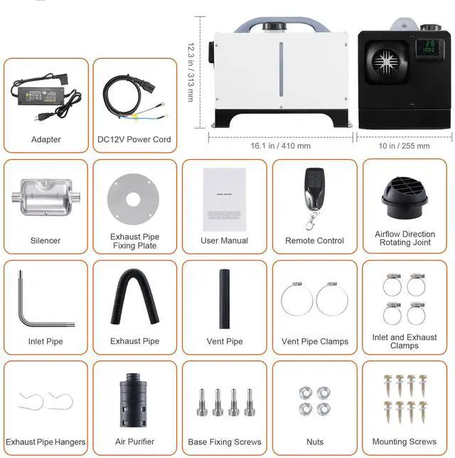 Fuel Consumption: 0.16-0.62 L/H,Operating Consumption: 12V/3A,Item Model Number: XMZ-W-D4,Heating Power: 5-8KW,Adjustable Temperature Range: 46.4-96.8/8-36,Net Weight: 21.2lbs/9.6 kg,Product Size: 16.1 x 10.0 x 12.3inch/410 x 255 x 313 mm