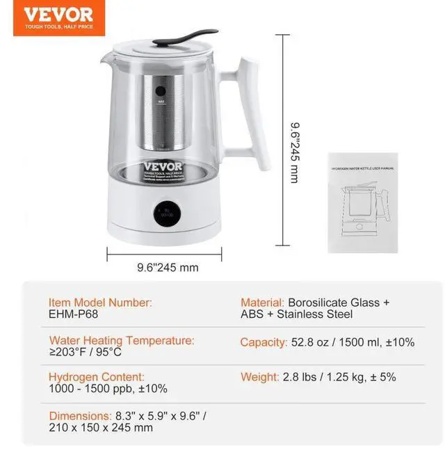 Hydrogen Content: 1000 - 1500 ppb, ±10%,Capacity: 52.8 oz / 1500 ml, ±10%,Item Model Number: EHM-P68-US/EHM-P68-EU,Dimensions: 8.3" x 5.9" x 9.6" / 210 x 150 x 245 mm,Material: Borosilicate Glass + ABS + Stainless Steel,Weight: 2.8 lbs / 1.25 kg, ± 5%,Water Heating Temperature: 203°F / 95