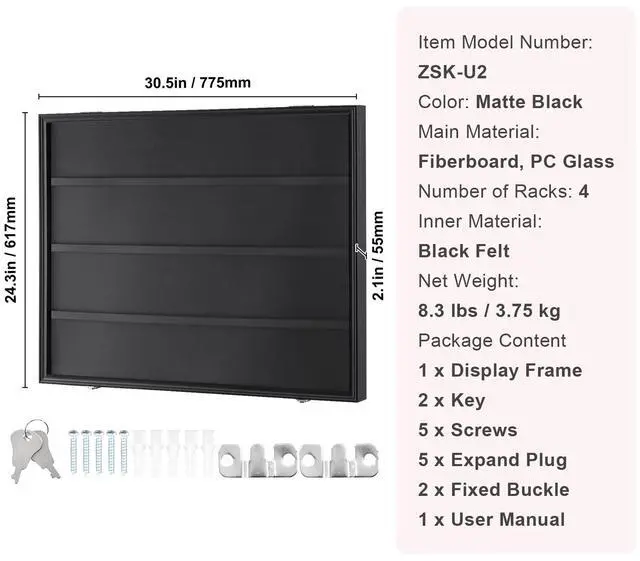 Number of Racks: 4,Color: Matte Black,Item Model Number: ZSK-U2,Inner Material: Black Felt,Net Weight: 8.3 lbs / 3.75 kg,Main Material: Fiberboard, PC Glass