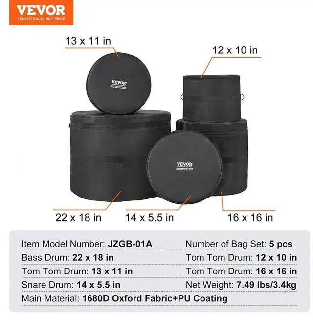 Snare Drum: 14 x 5.5 in/35.56 x 13.97 cm,Item Model Number: JZGB-01A,Number of Bag Set: 5 pcs,Kick Drum: 22 x 18 in/55.88 x 45.72 cm,Net Weight: 7.49 lbs/3 kg,Main Material: 1680D Oxford Fabric+PU Coating,Tom Drum: 16 x 16 in/40.64 x 40.64 cm
