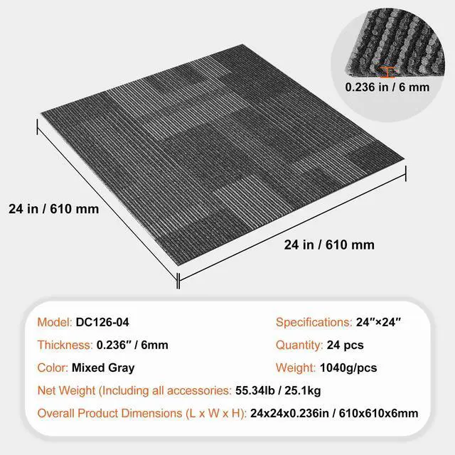 Thickness: 0.236 / 6mm,Specifications: 24x24,Color: Mixed Gray,Overall Product Dimensions (L x W x H): 24x24x0.236in / 610x610x6mm,Model: DC126-04,Quantity: 24pcs,Weight: 1040g/m²,Net Weight (Including all accessories): 55.34lb / 25.1kg
