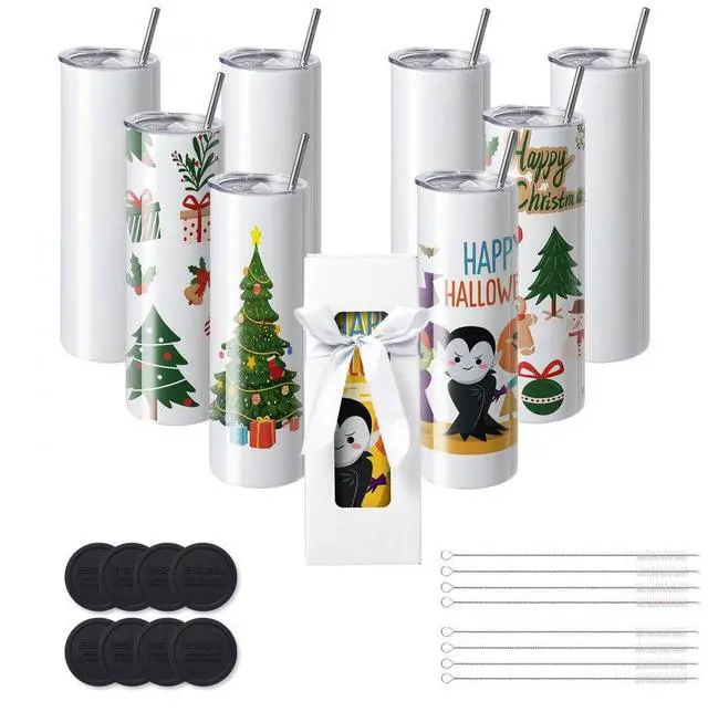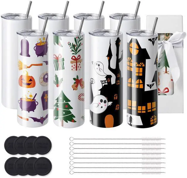 VEVOR 8 Pack 30 Oz Sublimation Tumblers, Skinny Straight Stainless Steel Blanks Cups, Stainless Steel Double Wall Tumbler for Heat Transfer Customized Gifts with Lid and Straw, Gift Box