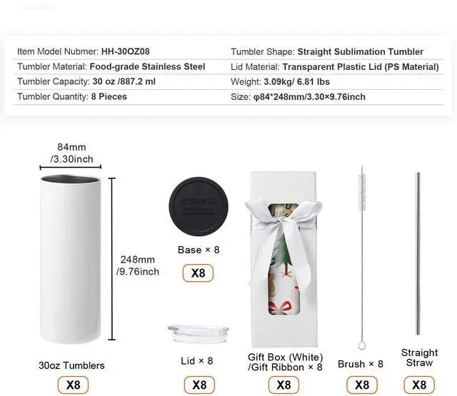 Tumbler Shape: Straight Sublimation Tumbler,Tumbler Quantity: 8 Pieces,Lid Material: Transparent Plastic Lid (PS Material),Item Model Number: HH-30OZ08,Tumbler Material: Food-grade Stainless Steel,Tumbler Capacity: 30 oz /887.2 ml,Weight: 3.09kg/ 6.81 lbs