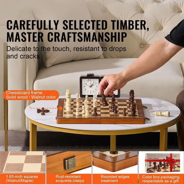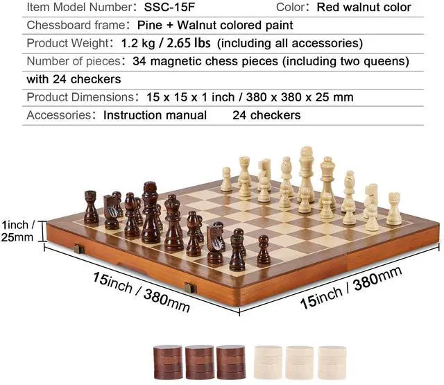 VEVOR Magnetic Wooden Chess Set, 15 inch 2-IN-1 Chess Checkers Game Set, Folding Chess Board Games for Adults Kids, 2 Queens Portable Travel Gift Chess Set for Tournament Professional Beginner