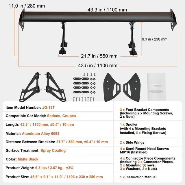Compatible Car Model: Sedans, Coupes,Length: 43.3" / 1100 mm ±0.4" / 10 mm,Color: Matte Black,Item Model Number: JG-137,Surface Treatment: Spray Coating,Product Weight: 6.3 lbs / 2.87 kg±3%,Material: Aluminum Alloy 6063,Distance Between Brackets: 21.7" / 550 mm, ±0.4" / 10 mm,Structure: Single Deck,Product Size: 43.5" x 9.1" x 11.0" / 1106 x 230 x 280 mm