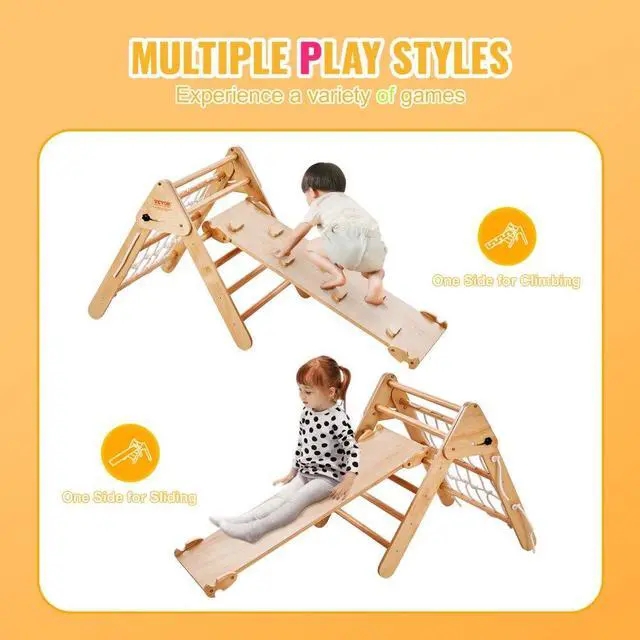VEVOR Pikler Triangle Set, 4 in 1 Toddler Climbing Toys Indoor Playground, Large Size Wooden Climbing Gym for Toddlers 1-3 Years, Montessori Climbing Set with Triangle and Ramp, Wood Color