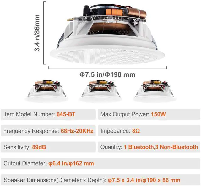 Sensitivity: 89dB,Item Model Number: 645-BT,Quantity: 4 PCs,Frequency Response: 68Hz-20KHz,Impedance: 8,Speaker Dimensions(Diameter x Depth): 7.5 x 3.4 in/190 x 86 mm,Max Output Power: 150W,Cutout Diameter: 6.4 in/162 mm