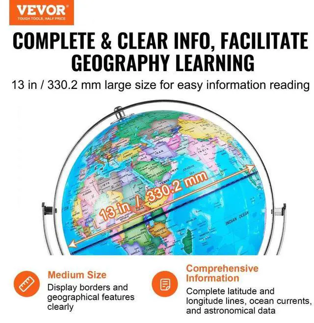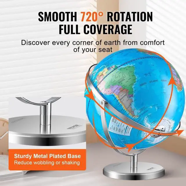 VEVOR Illuminated World Globe with Stand, 13 in/330.2 mm, Educational Earth Globe with Stable Heavy Metal Base and LED Constellation Night Light HD Printed Map, Spinning for Kids Classroom Learning