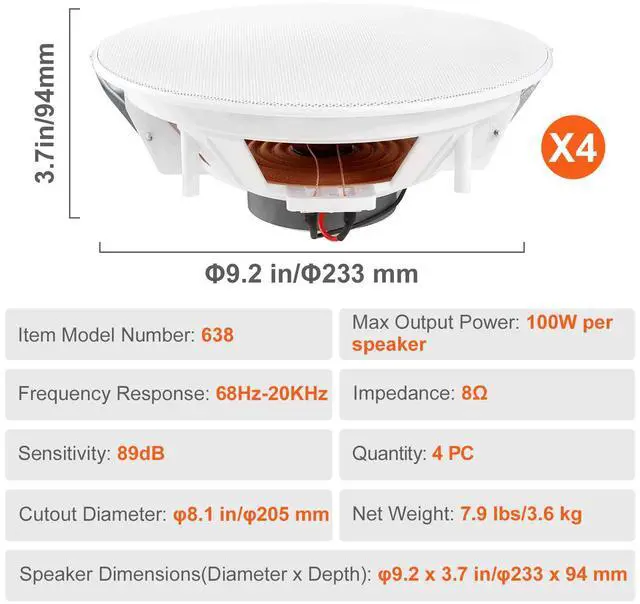 Sensitivity: 89dB,Item Model Number: 638,Quantity: 4 PCs,Frequency Response: 68Hz-20KHz,Impedance: 8,Speaker Dimensions(Diameter x Depth): 9.2 x 3.7 in/233 x 94 mm,Net Weight: 7.9 lbs/3.6 kg,Max Output Power: 100W per speaker,Cutout Diameter: 8.1 in/205 mm