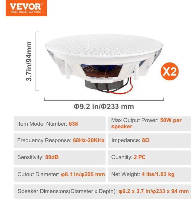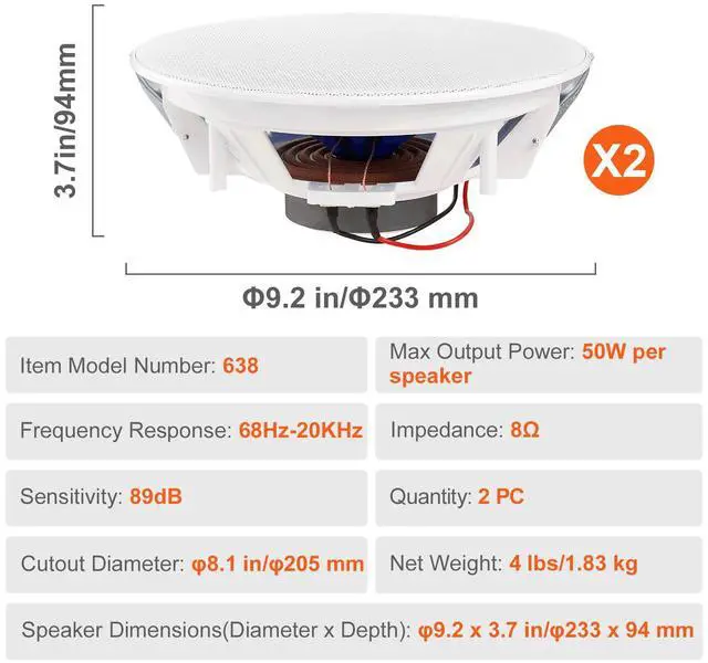 Sensitivity: 89dB,Item Model Number: 638,Quantity: 2 PCs,Frequency Response: 68Hz-20KHz,Impedance: 8,Speaker Dimensions(Diameter x Depth): 9.2 x 3.7 in/233 x 94 mm,Net Weight: 4 lbs/1.83 kg,Max Output Power: 50W per speaker,Cutout Diameter: 8.1 in/205 mm