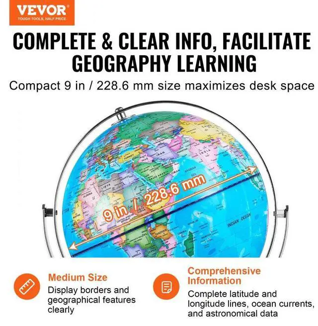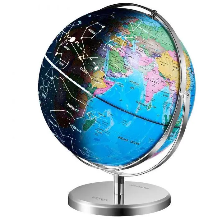 VEVOR Illuminated World Globe with Stand, 9 in/228.6 mm, Educational Earth Globe with Stable Heavy Metal Base and LED Constellation Night Light HD Printed Map, Spinning for Kids Classroom Learning