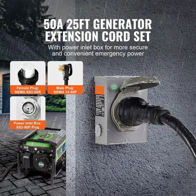 VEVOR 50 Amp Generator Cord and Power Inlet Box Kit, 25FT, NEMA 14-50P/SS2-50R STW 6/3+8/1 AWG Generator Power Cord with Twist Lock Connector, Pre-Drilled Inlet Box for Generator to House, ETL Listed