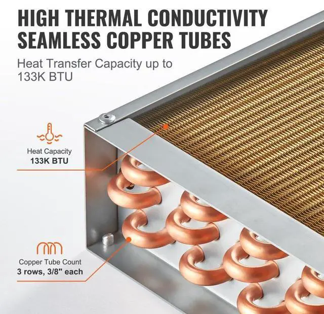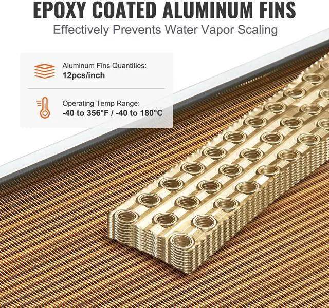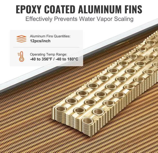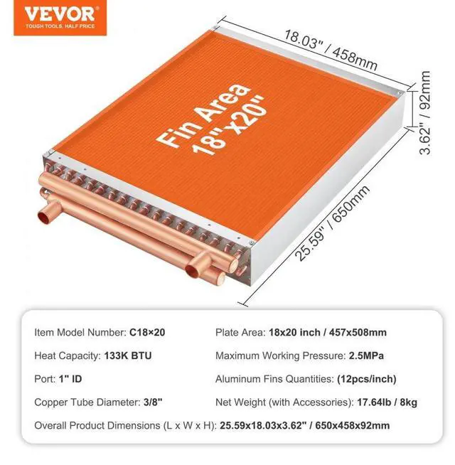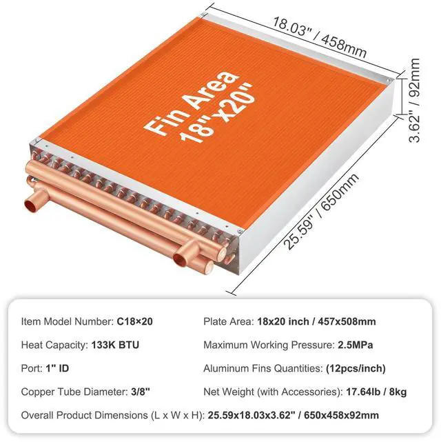 Operating Temperature: -40°C-180°C / -40°F -356°F,Main Materials: Copper,Maximum Working Pressure: 2.5MPa,Plate Area: 18 x 20 in / 45.72 x 50.8 cm,Heat Capacity: 133K BTU,Number of Aluminum Fins: 242 Pcs,Color: Gold,Model: C18×20,Number of Copper Tubes: 3-Row 3/8",Product Dimensions (L x W x H): 25.59x18.03x3.62" / 650x458x92 mm,Net Weight (with Accessories): 17.64lb / 8kg