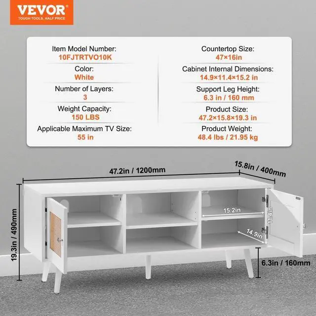 Number of Layers: 3,Cabinet Internal Dimensions: 14.9×11.4×15.2in/379×290×387mm,Weight Capacity: 150 LBS,Cabinet Countertop Size: 47×16in,Color: White,Item Model Number: 10FJTRTVO10K,Support Leg Height: 6.3in/160mm,Product Weight: 48.4lbs/21.95kg,Applicable Maximum TV Size: 55in,Product Size: 47.2×15.8×19.3in/1200×400×490mm