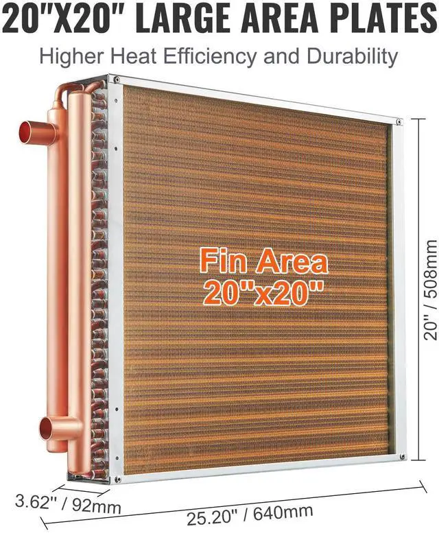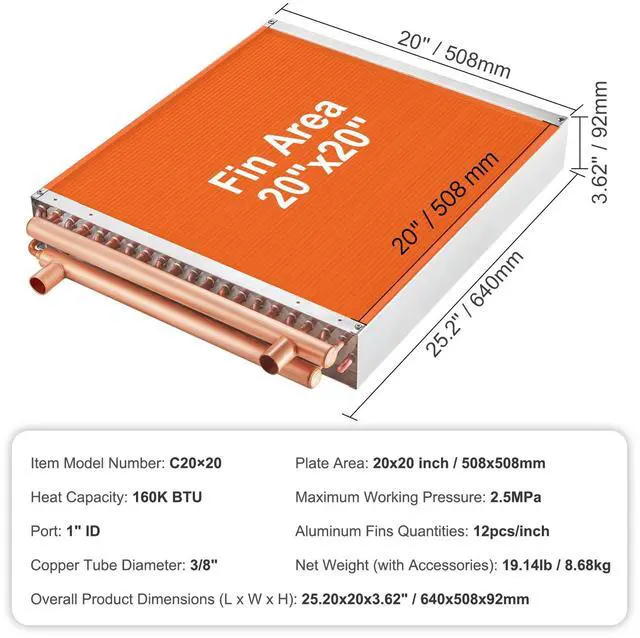 Operating Temperature: -40°C-180°C / -40°F -356°F,Main Materials: Copper,Maximum Working Pressure: 2.5MPa,Plate Area: 20 x 20 in / 50.8 x 50.8 cm,Heat Capacity: 160 K BTU,Number of Aluminum Fins: 242 Pcs,Color: Gold,Model: C20×20,Number of Copper Tubes: 3-Row 3/8",Product Dimensions (L x W x H): 25.20x20x3.62" / 640x508x92 mm,Net Weight (with Accessories): 19.14lb / 8.68kg