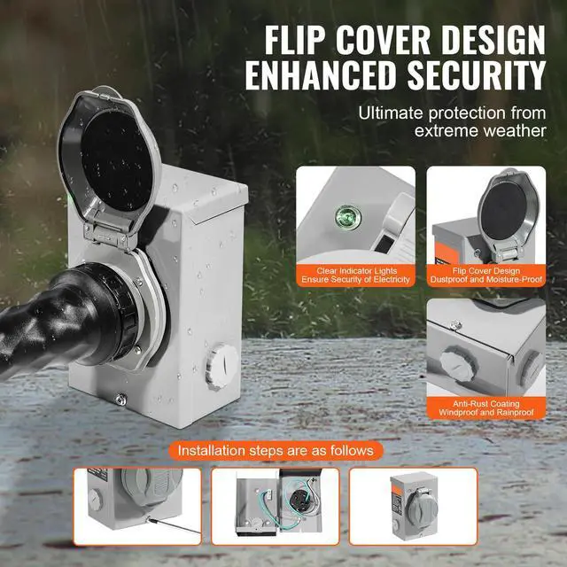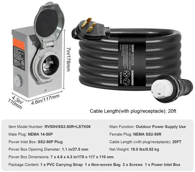 Main Function: Outdoor Power Supply Use,Power Inlet Box: SS2-50P Plug,Item Model Number: RV50H/SS2-50R+LSTK06,Female Plug: NEMA SS2-50R,Power Box Dimensions: 7 x 4.6 x 4.3 in/178 x 117 x 110 mm,Male Plug: NEMA 14-50P,Cable Length (with plug/receptacle): 20FT,Power Box Opening Diameter: 1.1 in/27.5 mm,Net Weight: 19.0 lbs/8.62 kg