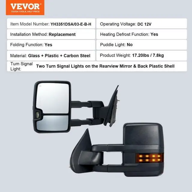 Installation Method: Replacement,Color: Black,Item Model Number: YH3351DSA/03-E-B-H,Compatible Brands and Models: Chevrolet Silverado (2003-2007)/GMC/Cadillac,Product Weight: 17.20 lbs/7.8 kg,Material: Glass + Plastic + Carbon Steel,Product Size: 19.69 x 12.20 x 5.91 in/500 x 310 x 150 mm