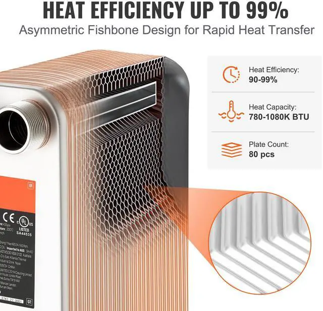 Plate Area: 5x12 inch/ 127x305mm,Heat Capacity: 780-1080K BTU,Port: 4*1-1/4" MNPT External Thread,Color: Stainless Steel + Copper Color,Model: EATB28-80,Thermal Efficiency: 9099%,Material: 304/316 Stainless Steel, Solder: 99.9% Copper Brazing,Plates Quantity(pcs): 80,Product Dimensions (L x W x H): 11.85x4.96x8.86" / 301x126x225 mm,Net Weight (with Accessories): 27.58lb / 12.51 kg