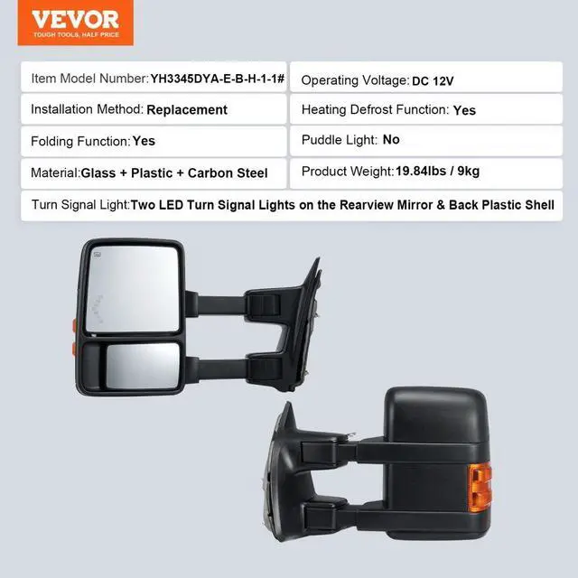 Installation Method: Replacement,Color: Black,Item Model Number: YH3345DYA-E-B-H-1-1#,Compatible Brands and Models: 1999-2007 Ford F250/F350/F450/F550,Product Weight: 19.84 lbs/9 kg,Material: Glass + Plastic + Carbon Steel,Product Size: 16.93 x 12.99 x 7.09 in/430 x 330 x 180 mm
