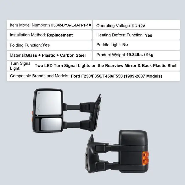 Installation Method: Replacement,Color: Black,Item Model Number: YH3345DYA-E-B-H-1-1#,Compatible Brands and Models: 1999-2007 Ford F250/F350/F450/F550,Product Weight: 19.84 lbs/9 kg,Material: Glass + Plastic + Carbon Steel,Product Size: 16.93 x 12.99 x 7.09 in/430 x 330 x 180 mm