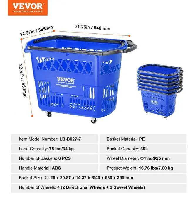 Basket Capacity: 39L,Load Capacity: 75 lbs/34 kg,Basket Material: PE,Number of Baskets: 6 PCS,Item Model Number: LB-B027-7,Product Weight: 16.76 lbs/7.60 kg,Basket Size: 21.26 x 20.87 x 14.37 in/540 x 530 x 365 mm,Number of Wheels: 4 (2 Directional Wheels + 2 Swivel Wheels),Handle Material: ABS