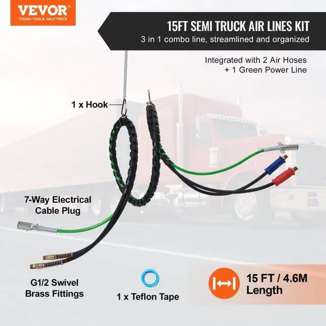VEVOR 15FT Semi Truck Air Lines Kit, 3-in-1 Air Hoses & ABS Power Line for Semi Truck Trailer Tractor, 7-Way Plug Electrical Cord Cable and Rubber Air Lines Hose Assembly Kit with Hook & Teflon Tape