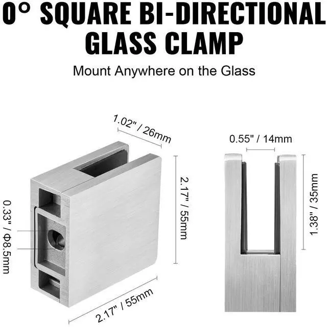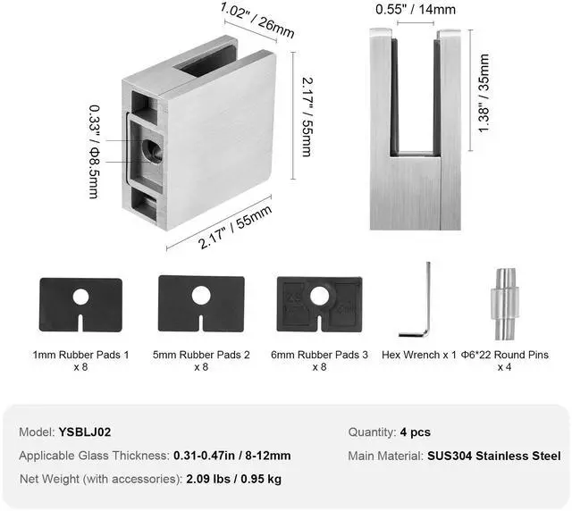 Applicable Glass Thickness: 0.31-0.47in / 8-12mm,Net Weight (with accessories): 2.09 lbs / 0.95 kg,Model: YSBLJ02,Overal Dimensions (L x W x H): 2.17x2.17x1.02" / 55x55x26mm,Quantity: 4 pcs,Main Material: SUS304 Stainless Steel