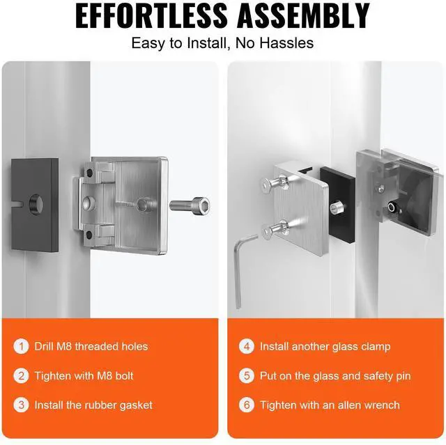 VEVOR Glass Clamp, 4 PCS Square Glass Railing Bracket for 0.31 "-0.47 " Tempered Glass, 304 Stainless Steel Glass Mounting Clamp, Glass Shelf Bracket for Balcony, Garden, Pool, Stair, Silver
