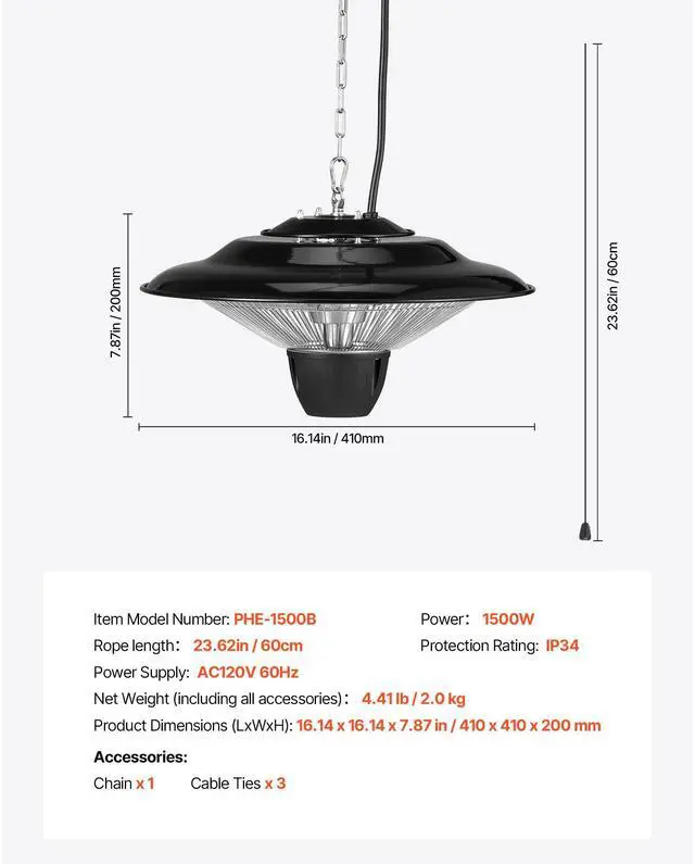 Protection Rating: IP34,Net Weight (including all accessories): 4.41 lb / 2.0 kg,Overall Dimensions (L x W x H): 16.14 x 16.14 x 7.87 in / 410 x 410 x 200 mm,Heating Tube Type: Halogen Tube,Model: PHE-1500B,Pull Cord Length: 23.62in / 60cm,Power: 1500W (+5%, -10%),Power Supply: AC120V 60Hz,Top Suspension Chain: Adjustable