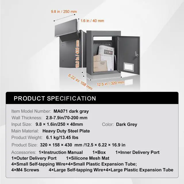 Input Size: 9.8 × 1.6 inch/250 × 40 mm,Color: Dark Grey,Item Model Number: MA071 dark gray,Product Weight: 6.1 kg/13.45 lbs,Wall Thickness: 2.8-7.9 inch/70-200 mm,Main Material: Heavy Duty Steel Plate,Product Size: 320 × 158 × 430 mm /12.6 × 6.22 × 16.93 inch