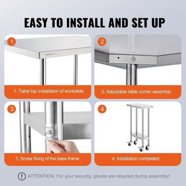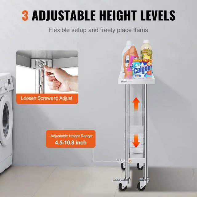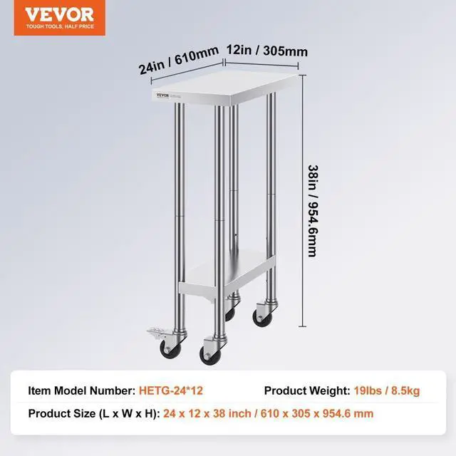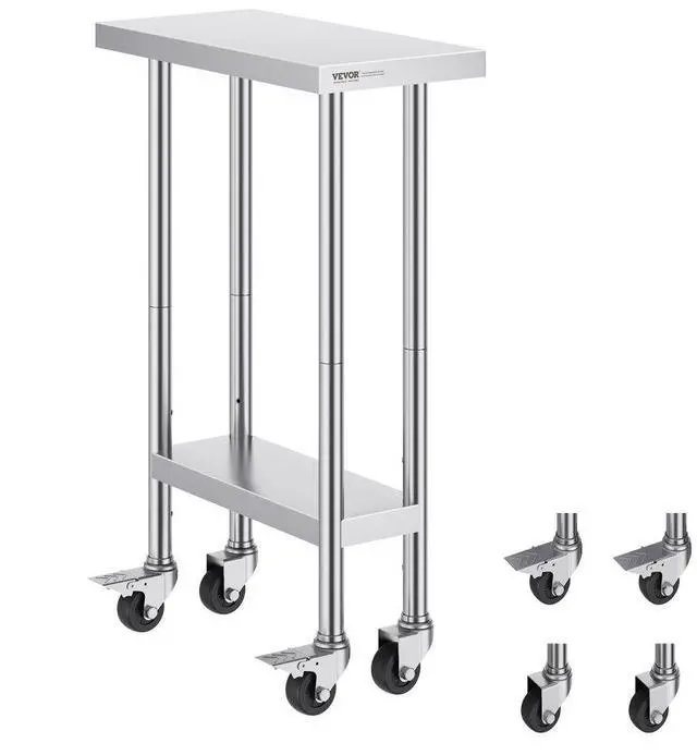 VEVOR Stainless Steel Work Table 24 x 12 x 38 Inch, with 4 Wheels, 3 Adjustable Height Levels, Heavy Duty Food Prep Worktable for Commercial Kitchen Restaurant, Silver