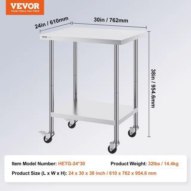 VEVOR Stainless Steel Work Table 24 x 30 x 38 Inch, with 4 Wheels, 3 Adjustable Height Levels, Heavy Duty Food Prep Worktable for Commercial Kitchen Restaurant, Silver