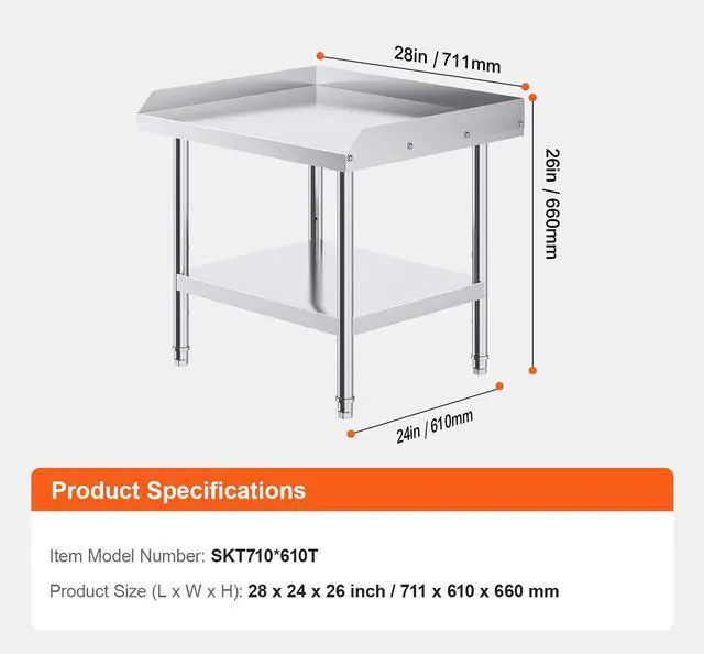 Product Size (L x W x H): 24 x 28 x 26 inch / 610 x 711 x 660 mm,Backsplash Height: 2 in / 5 cm,Item Model Number: SKT710*610T,Product Weight: 27 lbs / 12.25 kg,Material: Stainless Steel
