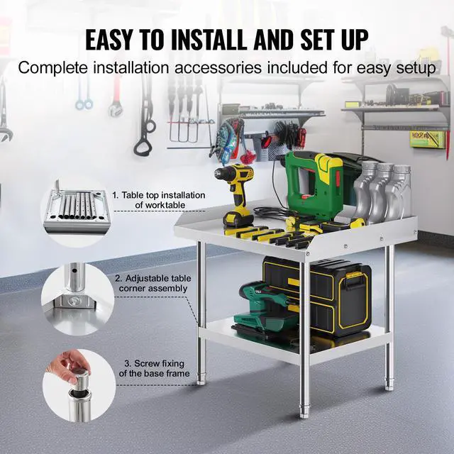 VEVOR Stainless Steel Work Table, 24 x 28 x 26 Inch Commercial Food Prep Worktable, 3-Sided Backsplash Heavy Duty Prep Worktable, Metal Work Table with Adjustable Height for Restaurant Home Hotel