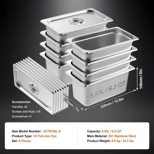 VEVOR 8 Pack Hotel Pans, 1/3 Size Anti-Jam Steam Pan with Lid, 0.8mm Thick Stainless Steel Steam Table Pan, 6-Inch Deep Commercial Table Pan, Catering Storage Food Pan, for Industrial & Scientific