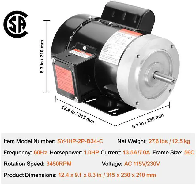 Horsepower: 1.0HP,Voltage: AC 115V/230V,Item Model Number: SY-1HP-2P-B34-C,Frequency: 60Hz,Product Dimensions: 12.4 x 9.1 x 8.3 in / 315 x 230 x 210 mm,Current: 13.5/7.0A,Net Weight: 27.6 lbs /12.5 kg,Frame Size: 56C,Rotation Speed: 3450 RPM