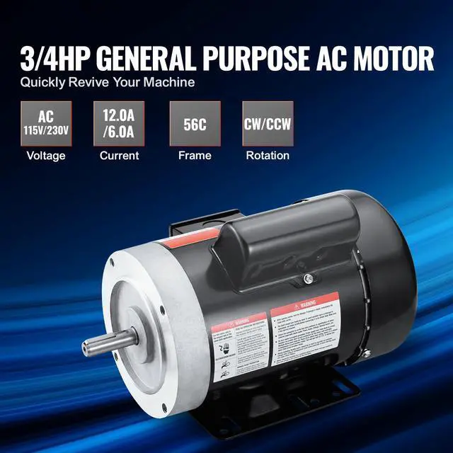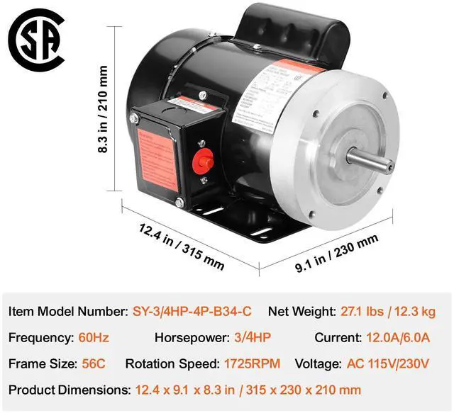 Horsepower: 0.75HP,Voltage: AC 115V/230V,Item Model Number: SY-3/4HP-4P-B34-C,Frequency: 60Hz,Product Dimensions: 12.4 x 9.1 x 8.3 in / 315 x 230 x 210 mm,Current: 12.0/6.0A,Net Weight: 27.1 lbs / 12.3 kg,Frame Size: 56C,Rotation Speed: 1725RPM
