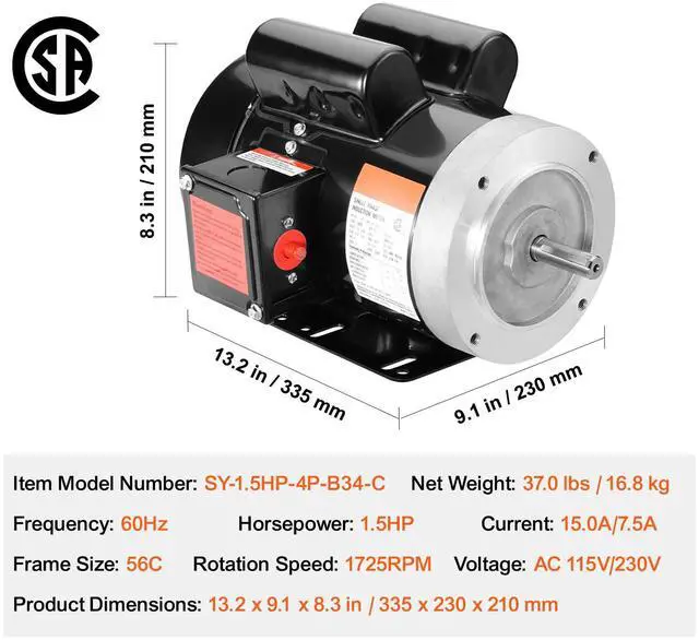 Horsepower: 1.5HP,Voltage: AC 115V/230V,Item Model Number: SY-1.5HP-4P-B34-C,Frequency: 60Hz,Product Dimensions: 13.2 x 9.1 x 8.3 in / 335 x 230 x 210 mm,Current: 15.0/7.5A,Net Weight: 37.0 lbs / 16.8 kg,Frame Size: 56C,Rotation Speed: 1725 RPM