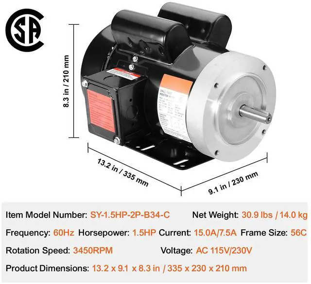 Horsepower: 1.5 HP,Voltage: AC 115V/230V,Item Model Number: SY-1.5HP-2P-B34-C,Frequency: 60Hz,Product Dimensions: 13.2 x 9.1 x 8.3 in / 335 x 230 x 210 mm,Current: 15.0/7.5A,Net Weight: 30.9 lbs / 14.0 kg,Frame Size: 56C,Rotation Speed: 3450 RPM