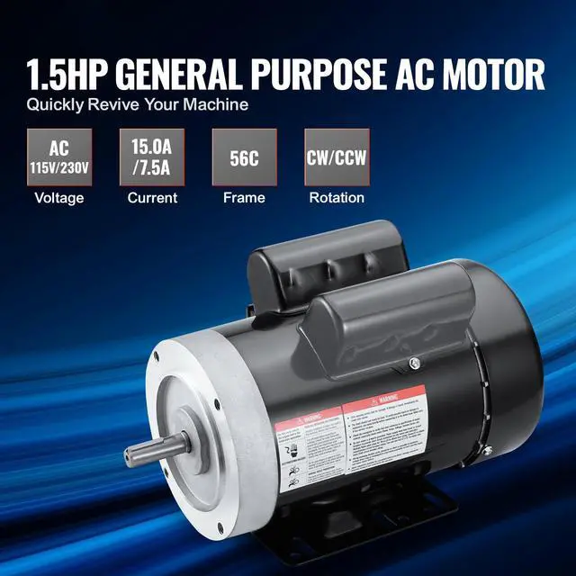 VEVOR 1.5HP Electric Motor 3450 rpm, AC 115V/230V, 56C Frame, Air Compressor Motor Single Phase, 5/8" Keyed Shaft, CW/CCW Rotation for Agricultural Machinery and General Equipment