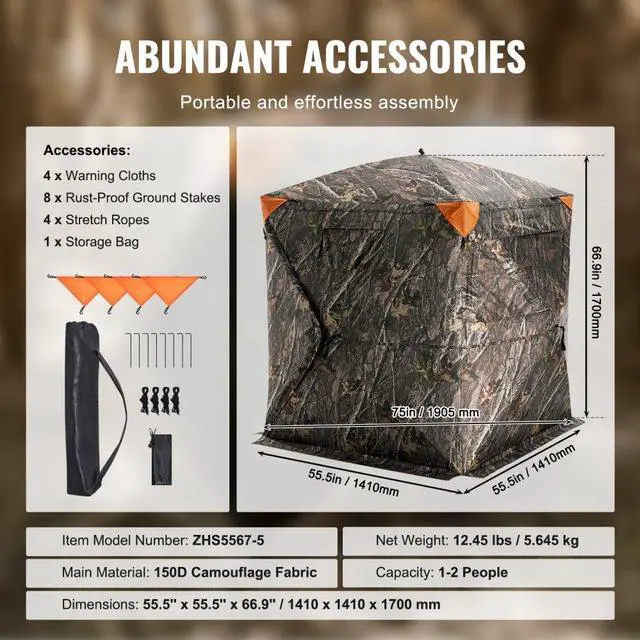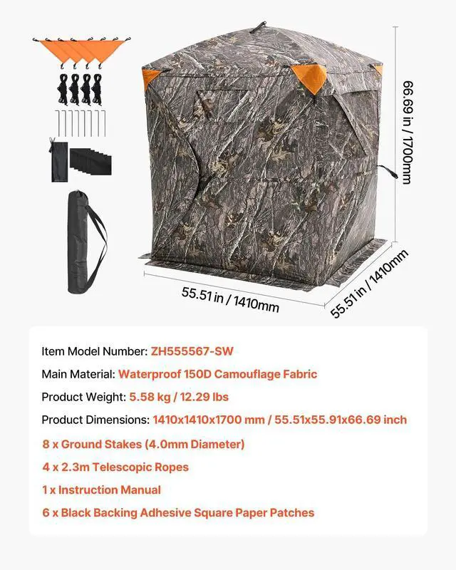 Item Model Number: ZHS5567-5,Dimensions: 55.5" x 55.5" x 66.9" / 1410 x 1410 x 1700 mm,Net Weight: 12.45 lbs / 5.645 kg,Main Material: 150D Camouflage Fabric