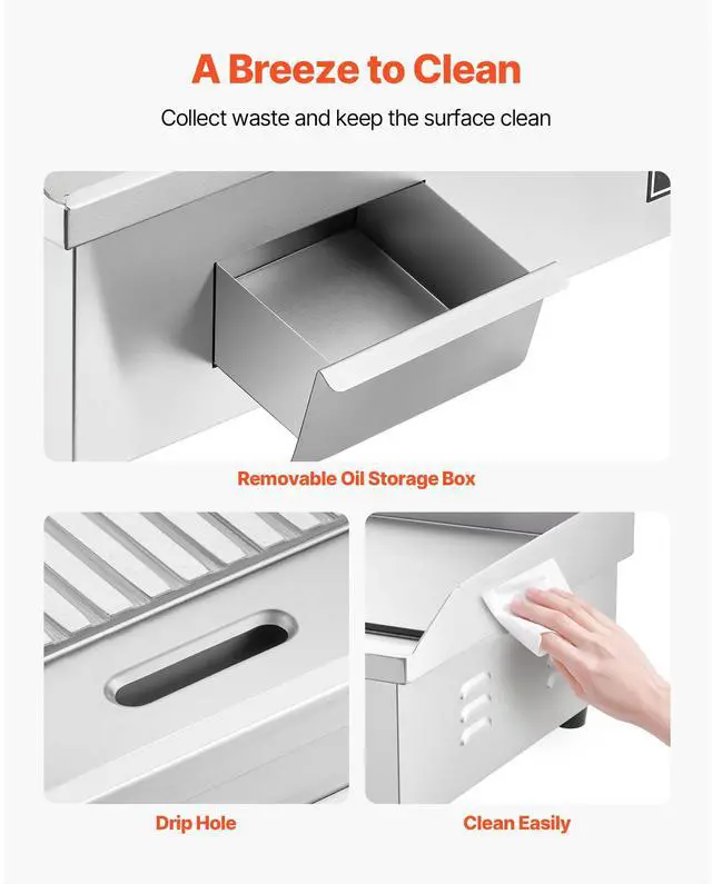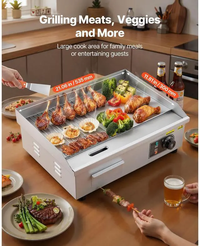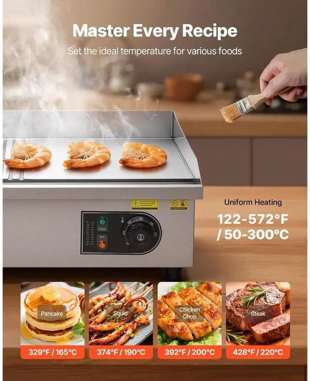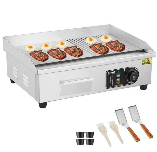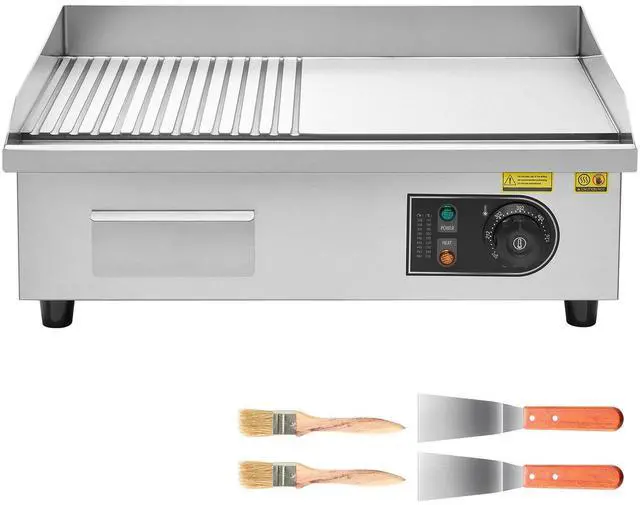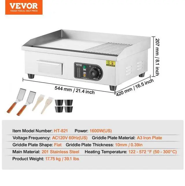 VEVOR Commercial Electric Griddle, 1600W Countertop Half-Flat Top Grill, 122-572 Adjustable Temp, 21.26x11.81x0.39in Stainless Steel Griddle Grill with 2 Shovels and 2 Brushes for Home or Restaurant