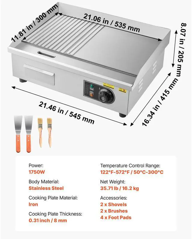 Griddle Plate Thickness: 10mm / 0.39in,Griddle Plate Material: A3 Iron Plate,Griddle Plate Shape: Half-Grooved, Half-Flat,Voltage Frequency: AC120V 60Hz(US), AC220-240V 50Hz(EU),Item Model Number: HT-821,Product Weight: 17.75 kg / 39.1 lbs,Heating Temperature: 122 - 572 °F (50 - 300°C),Power: 1600W(US), 3200W(EU),Main Material: 201 Stainless Steel
