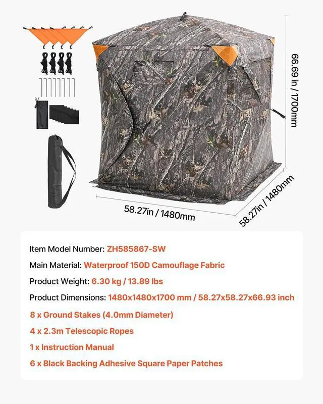 Item Model Number: ZHS5867-6,Dimensions: 58.3" x 58.3" x 67.1" / 1480 x 1480 x 1705 mm,Net Weight: 14.1 lbs / 6.395 kg,Main Material: 150D Camouflage Fabric