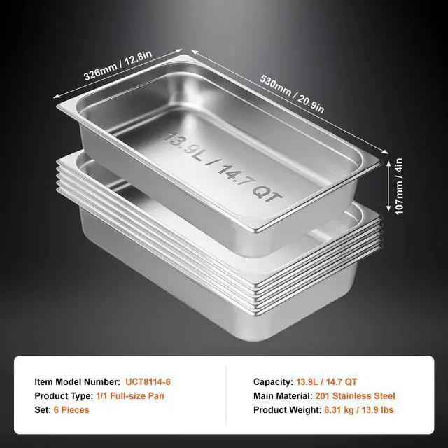 VEVOR 6 Pack Hotel Pans, Full Size Anti-Jam Steam Pan, 0.8mm Thick Stainless Steel Restaurant Steam Table Pan, 4-Inch Deep Commercial Table Pan, Catering Storage Food Pan, for Industrial & Scientific