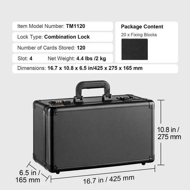 Item Model Number: TM1120 Lock Type: Combination Lock Number of Cards Stored: 120 Slot: 4 Net Weight: 4.4 lbs/2 kg Dimensions: 16.7 x 10.8 x 6.5 in/425 x 275 x 165 mm