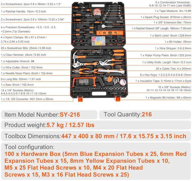Toolbox Dimensions: 447 x 400 x 80mm / 17.6 x 15.75 x 3.15 inch,Item Model Number: SY-216,Product Weight: 5.7 kg / 12.57 lbs,Tool Quantity: 216