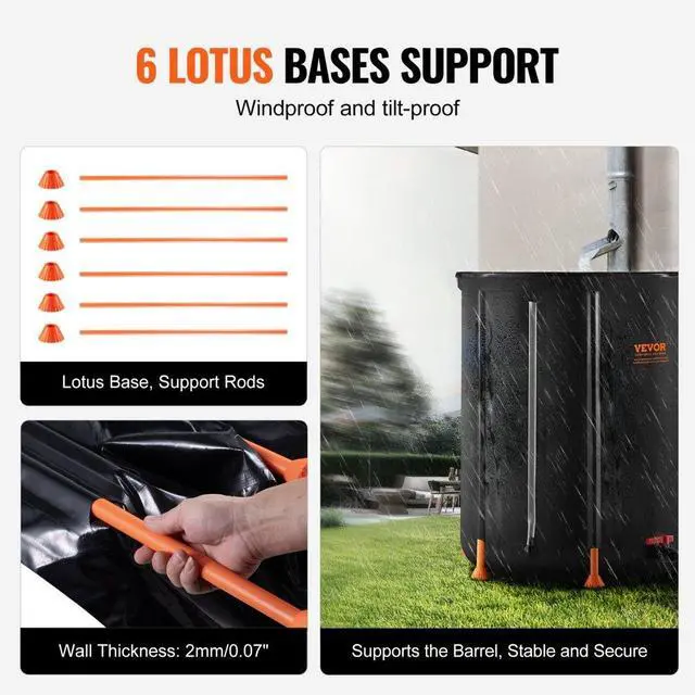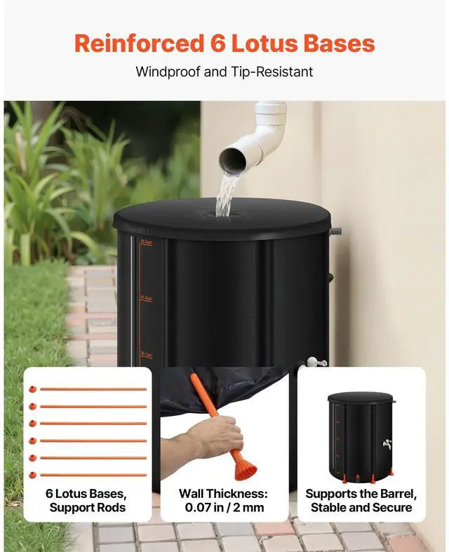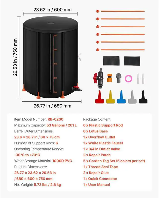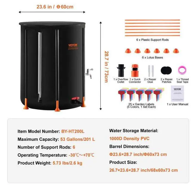 Barrel Dimensions: 23.6×28.7 inch/60x73 cm,Number of Support Rods: 6,Operating Temperature: -30+70,Item Model Number: BY-HT200L,Maximum Capacity: 53 Gallons/201 L,Product Weight: 5.73 lbs/2.6 kg,Water Storage Material: 1000D Density PVC,Product Size: 26.7×23.6×28.7 inch/68x60x73 cm