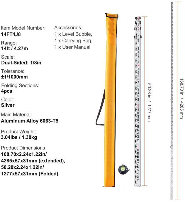 Product Size (folded): 50.28x2.24x1.22in / 1277x57x31mm,Graduation: Double-sided: 1/8in,Product Size (unfolded): 168.70x2.24x1.22in / 4285x57x31mm,Sections: 4pcs,Color: Silver,Model: 14FT4J8,Product Weight: 3.04lbs / 1.38kg,Range: 14ft/4.27m,Main Material: Aluminum Alloy 6063-T5,Range Tolerance: ±1/1000mm