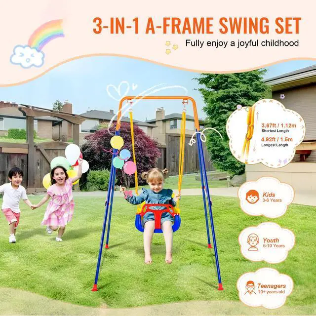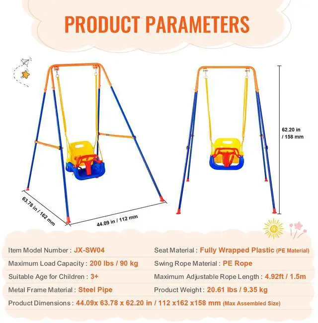 Metal Frame Material: Steel Pipe,Item Model Number: JX-SW04,Maximum Load Capacity: 200 lbs / 90 kg,Product Weight: 20.61 lbs / 9.35 kg,Swing Rope Material: PE Rope,Maximum Adjustable Rope Length: 4.92ft/1.5m,Suitable Age for Children: 3+,Seat Material: Fully Wrapped Plastic (PE Material)